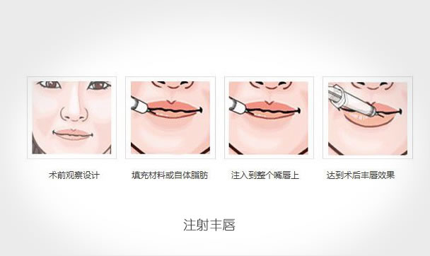 2、注射丰唇:是将玻尿酸和自体脂肪等材料注射进唇部的指定部位,使唇部充盈饱满。