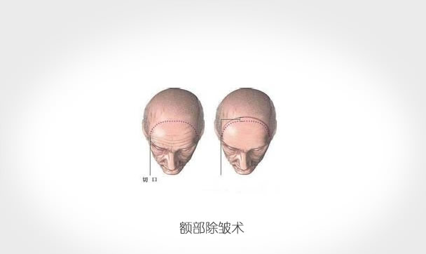 适合于额部皱纹多而深、眉毛与上眼皮下垂的人。额部皱纹是由于额肌形成抬头纹)、皱眉肌眉间纵纹)、降眉肌鼻根横纹)的收缩以达面部表情所致。手术切口选择在发际线上或头发内。手术分离前额皮肤和肌肉,将肌肉切除或切断,然后分别向上、向后提紧分离的皮肤与眉毛。切除多余的皮肤后,精细缝合切口。